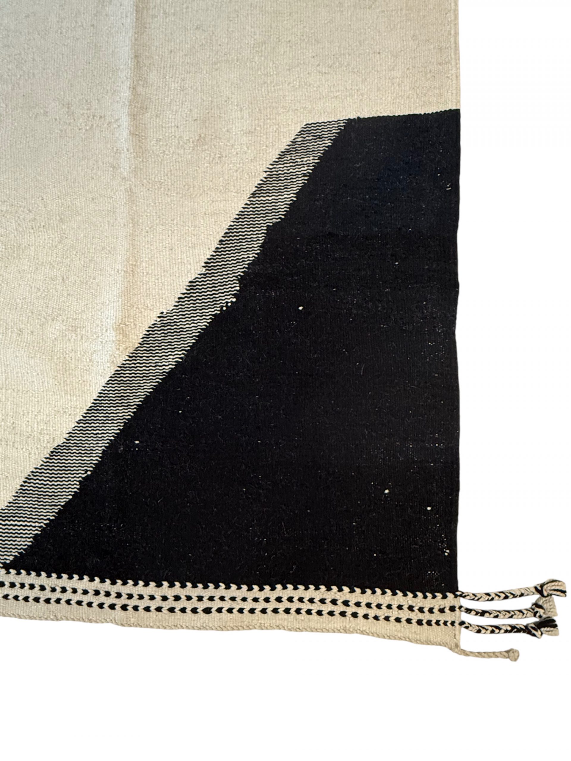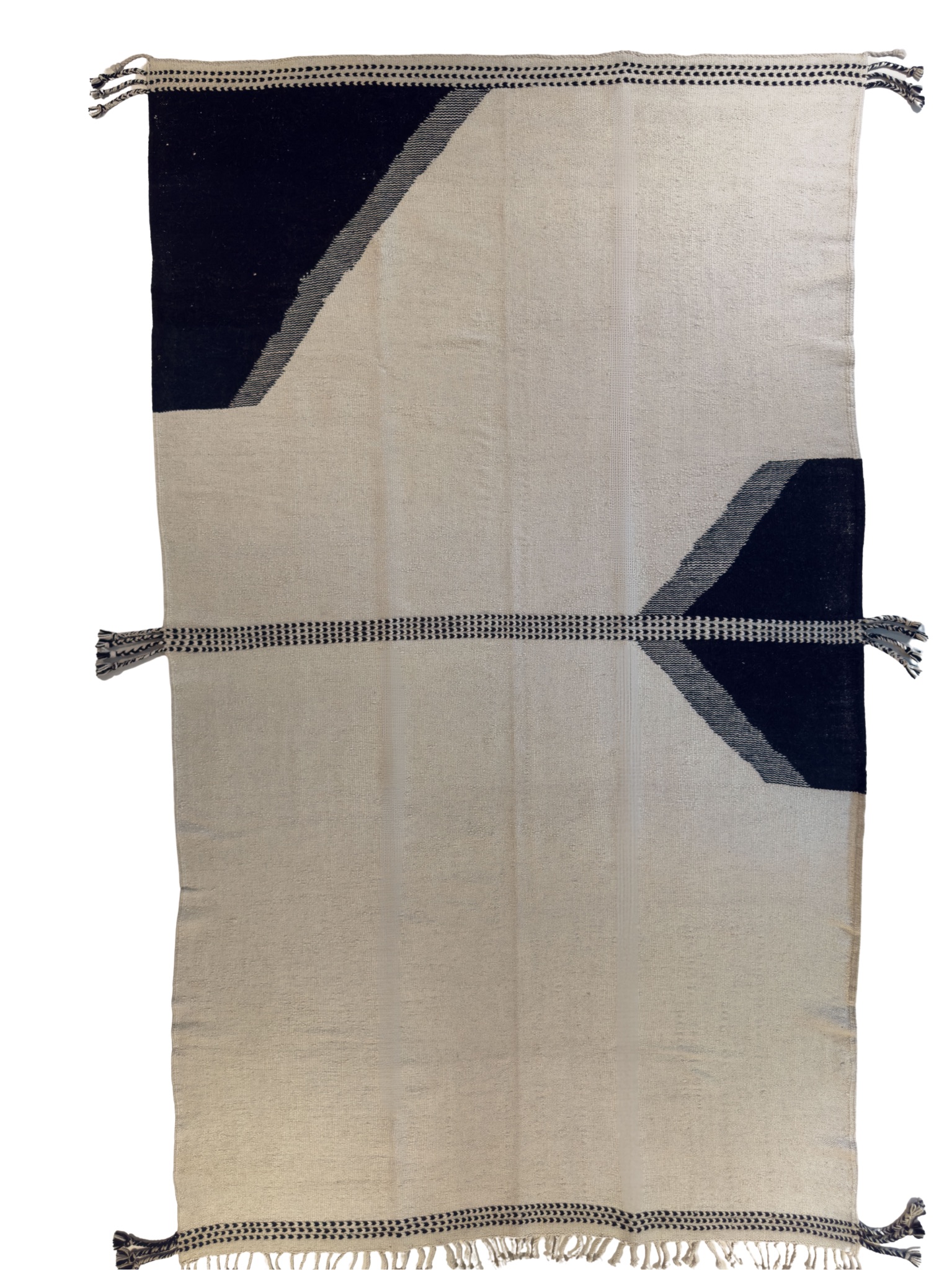 Charakteristisch für den Afaq Kelim ist sein ruhiges, grafisches Design. Der helle Grundton aus naturfarbener Wolle wird von markanten dunkelblauen Flächen ergänzt, die eine klare geometrische Komposition bilden. Diese reduzierte Gestaltung verleiht dem Teppich eine zeitlose Ästhetik, die sowohl in moderne als auch in klassische Wohnkonzepte passt. Besonders in minimalistisch gestalteten Räumen, skandinavischen Interieurs oder zeitgenössischer Architektur entfaltet der Kelim seine ruhige und elegante Wirkung.