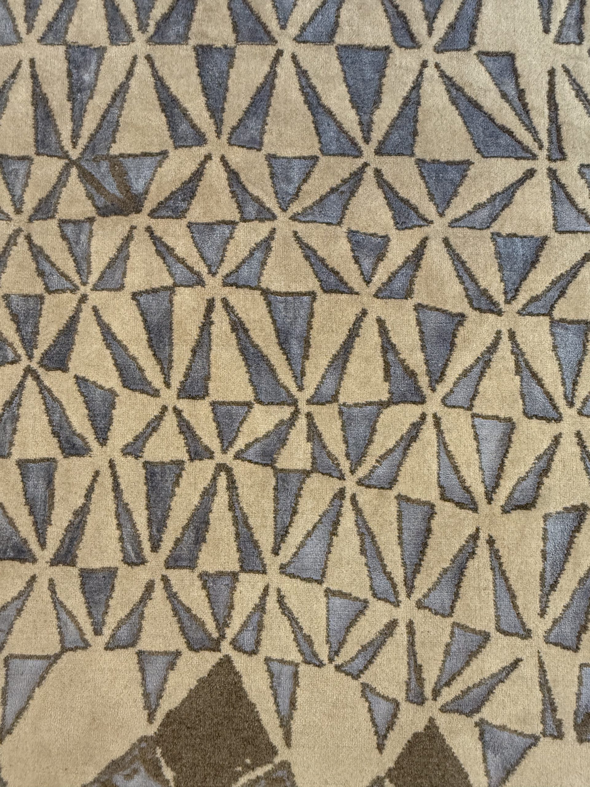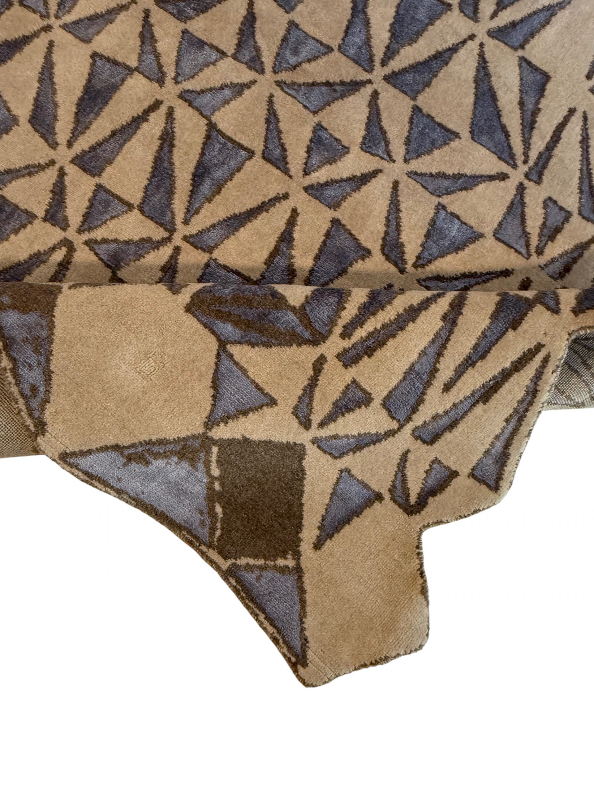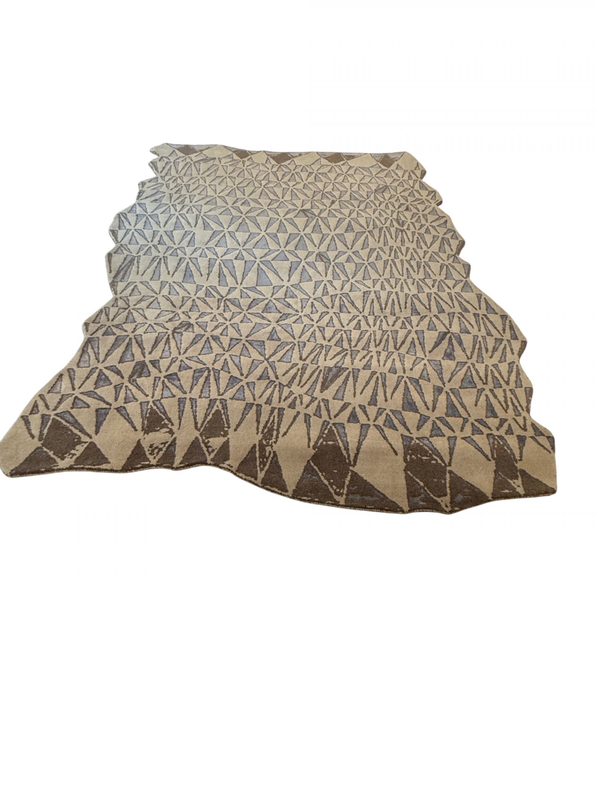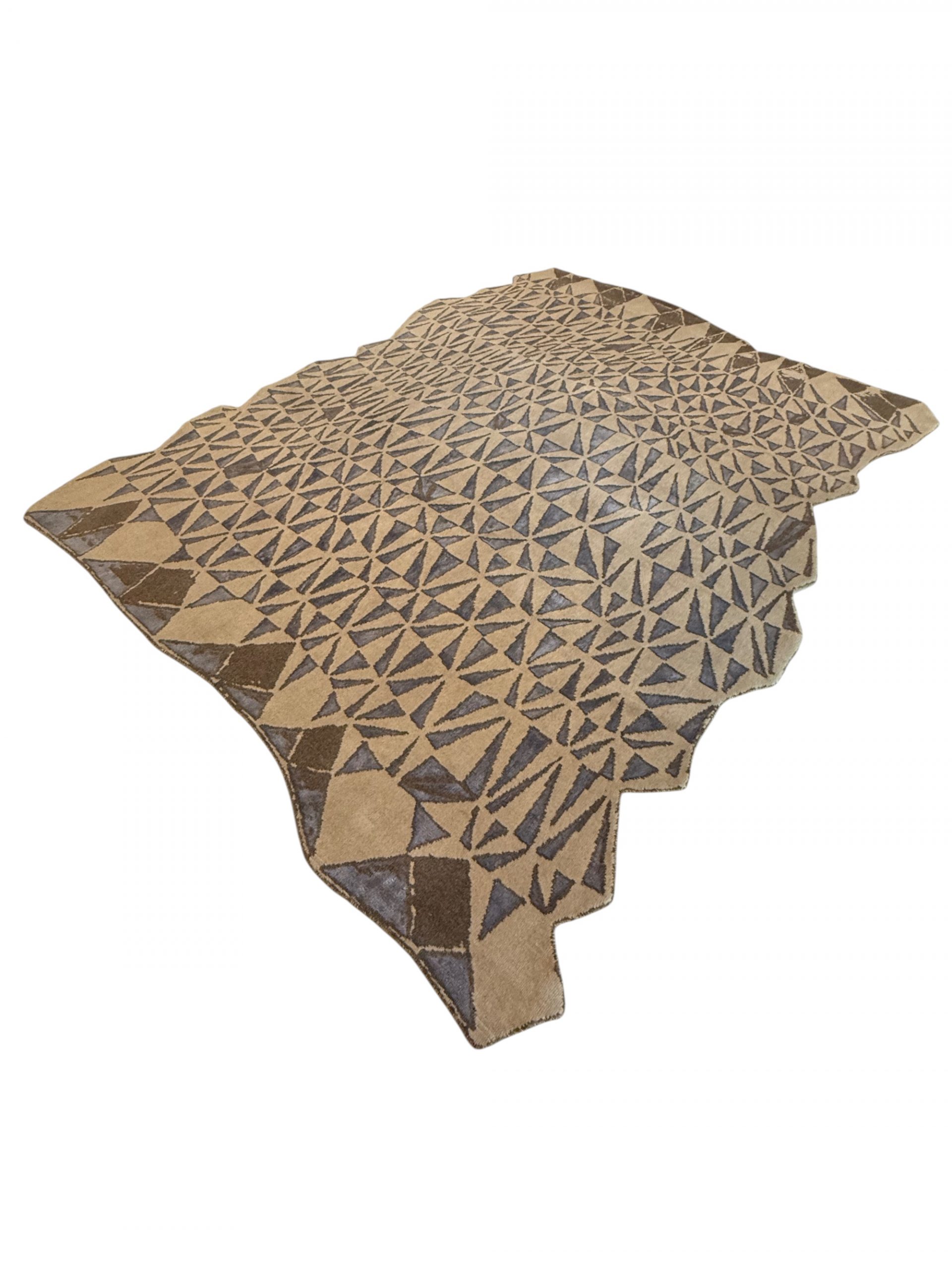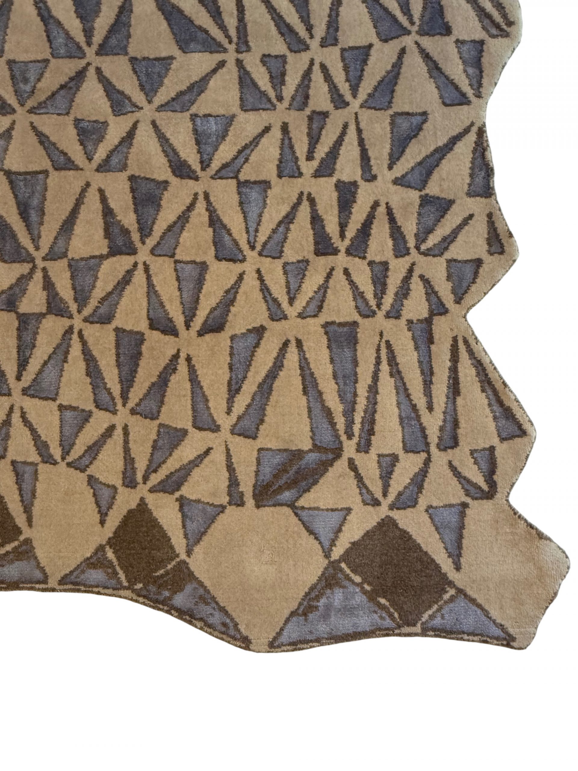 Der GeoFlow Teppich steht für modernes Design, hochwertige Materialien und sorgfältige Handarbeit. Sein ausdrucksstarkes, geometrisches Muster aus feinen Dreiecksformen erzeugt eine dynamische Flächenwirkung, die je nach Lichteinfall immer wieder neue Akzente setzt. Die bewusst organisch gehaltene Außenform lockert die klare Geometrie auf und verleiht dem Teppich eine fast skulpturale Präsenz im Raum.